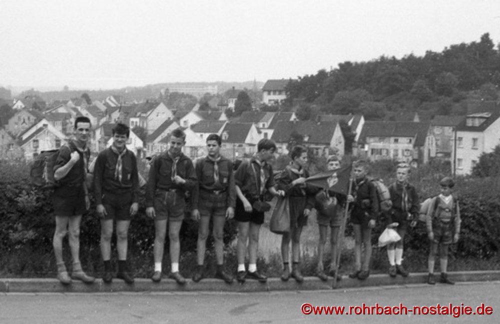 1961 – Rohrbacher Pfadfinder vom Stamm Wikinger starten auf eine Fahrt ins Dahner Felsenland. Auf dem Foto von links: Lothar Gehring – Arnold Metzger – Jürgen Schreiber – Kurt Peter – Joachim Tinschert – Ludwig Kaub – Edmund Scheffler – Thomas Spies – Martin Spies