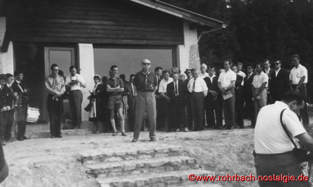 1964 - Landesfeldmeister Albert Rottorf während den Einweihungsfeierlichkeiten bei seiner Begrüßungsrede. Dahinter der Männerchor 1860 Rohrbach und die Mitglieder des Rohrbacher Gemeinderates