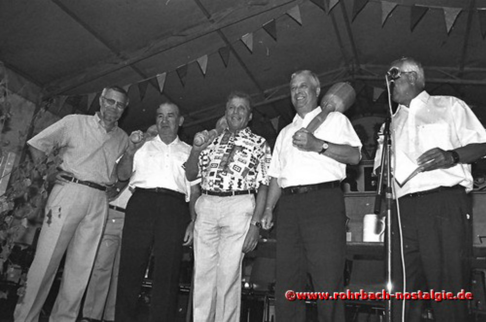 1998 Männer der ersten Stunde des Alt-Rohrbachfestes werden mit einem Stampesstößer geehrt. Von links: Gisbert Groh, Ottmar Schmitt, Ewald Jung, Hans-Joachim Stumpf und Ortsvorsteher Bodo Schiehl