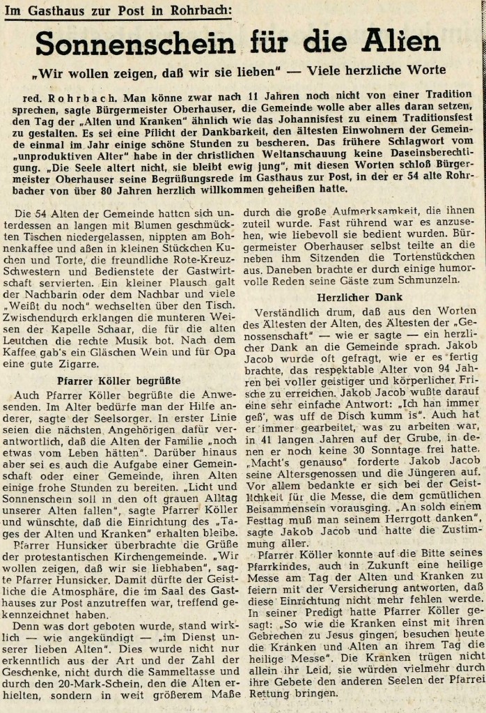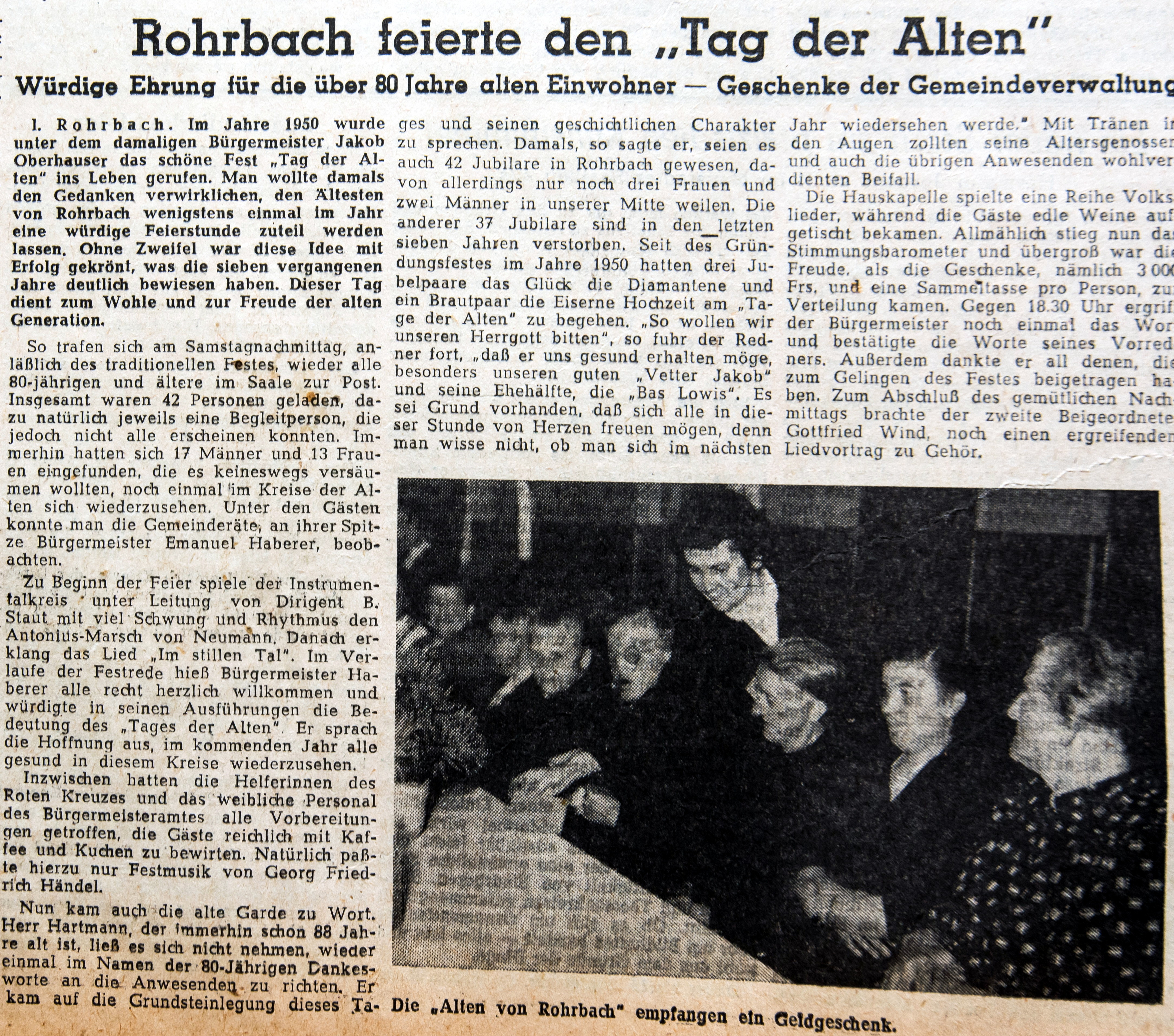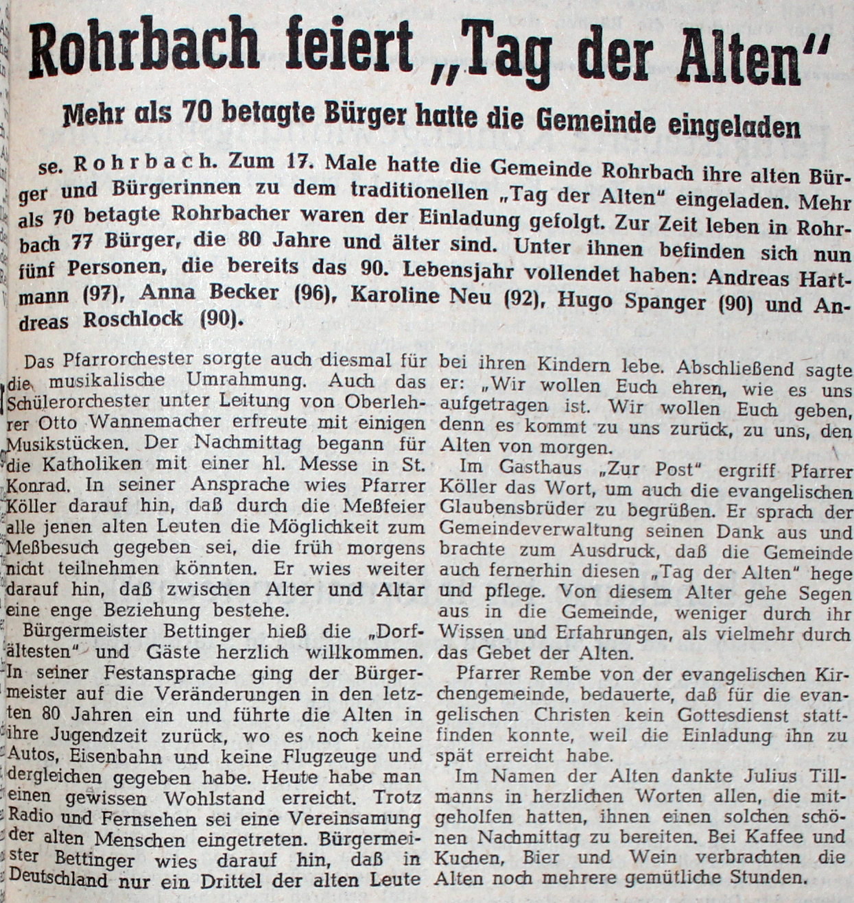 „ Zum achtzehnten Male feiern wir heute den Tag der Alten, jenen Feiertag, der in unserer Gemeinde seine Geburtstagstunde hatte, inzwischen zur Tradition geworden ist und aus dem Rohrbacher Kalender nicht mehr gestrichen werden kann“. Mit diesen Worten eröffnete Bürgermeister Walter Bettinger im Juli 1967 den „Tag der Alten“, zu dem er die betagten Bürger der Gemeinde willkommen hieß. Mehr als achtzig Bürger- und Bürgerinnen kamen zum „Dorffest der Alten“, darunter 21 Frauen und Männer, denen erstmals die Ehrung durch die Gemeinde widerfuhr.
