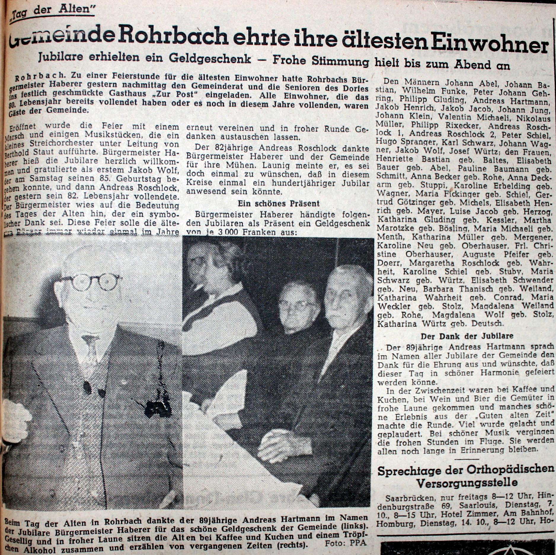 Als im Jahr 1950 der Gemeinderat Rohrbach den Beschluss fasste, den 80. Geburtstag des damaligen Rektors der Katholischen Volksschule Firmery feierlich zu begehen, und zwar mit gleichzeitiger Ehrung aller Achtzigjährigen der Gemeinde, fand dieser Beschluss in allen Bevölkerungskreisen einen freudigen und lebhaften Widerhall.