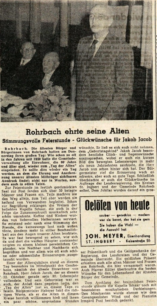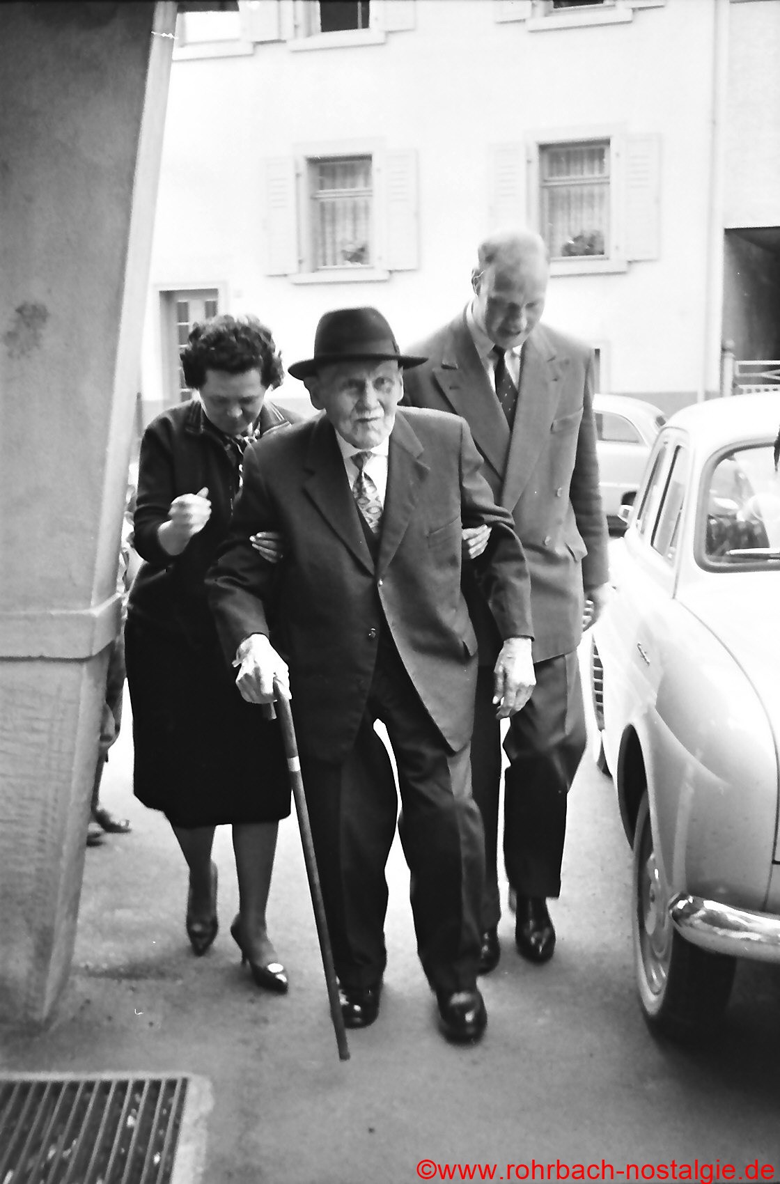 1963 wird der älteste Bürger der Gemeinde Rohrbach Jakob Jacob (Doppel Jääb), damals 97-jährig, von seiner Tochter Barbara Müller und dem Gemeinderatsmitglied Alfons Charrois zum Tag der Alten gebracht