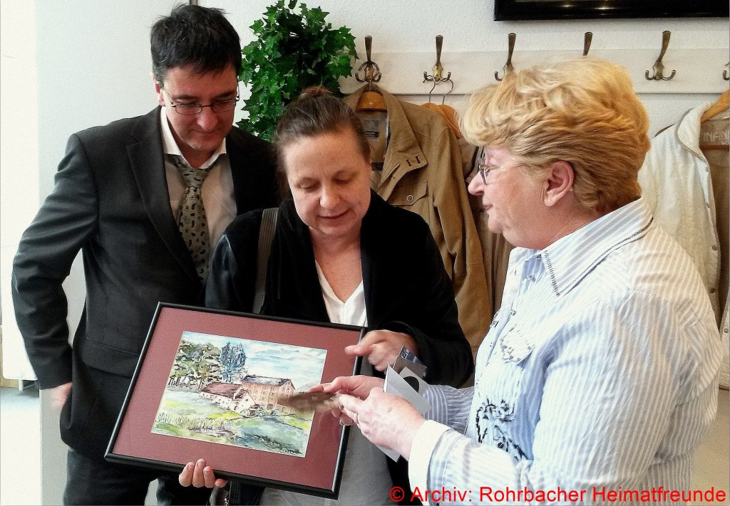 2016 Vorstandsmitglied Marie-Luise Lott-Weißer übergibt dem neuen Besitzerpaar der Rohrbacher Mühle Dr. Andreas Meiser und seiner Frau Dr. Magdalena Telus ein Gemälde von der Rohrbacher Mühle