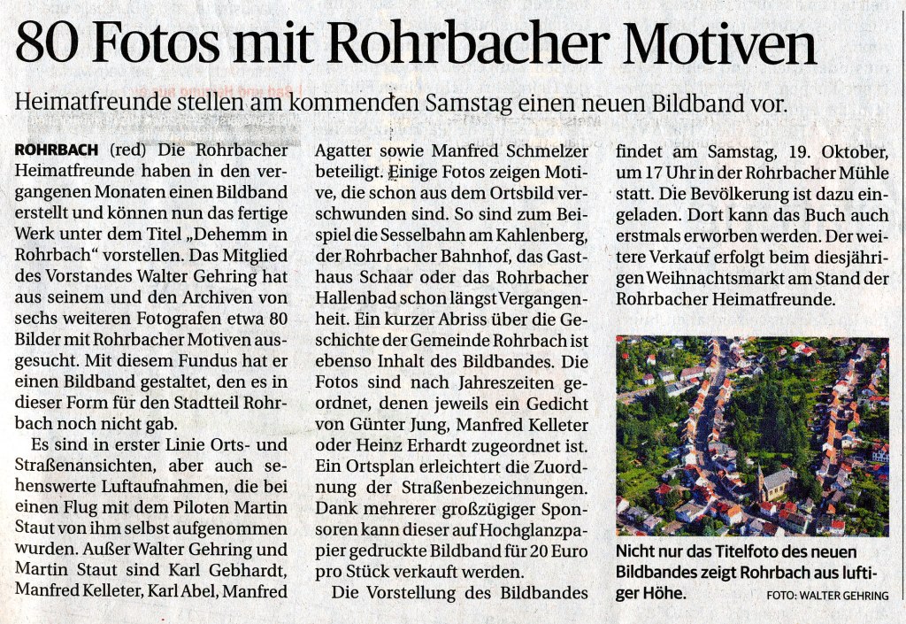 Im Artikel auf meiner Webseite „Die Rohrbacher Heimatfreunde feiern ihr 30-jähriges Bestehen können sie sich über die Aktivitäten des Vereins in den ersten Jahren informieren. Einfach auf den Link klicken.