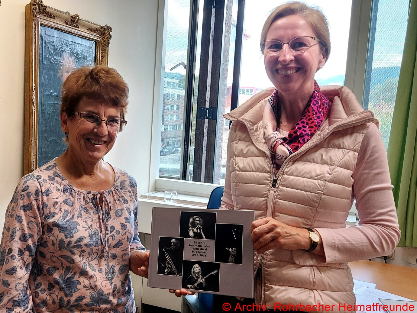 2019 Die Vorsitzende der Rohrbacher Heimatfreunde Rosemarie Wagner bei ihrem Antrittsbesuch bei der neuen Leiterin des Stadtarchivs St. Ingbert, Frau Dr. Heidemarie Ertle. Als Geschenk der Heimatfreunde übergab sie den Bildband „25 Jahre Internationales Jazzfestival St. Ingbert 1987-2011″ vom bekannten Rohrbacher Jazzfotografen Walter Gehring.