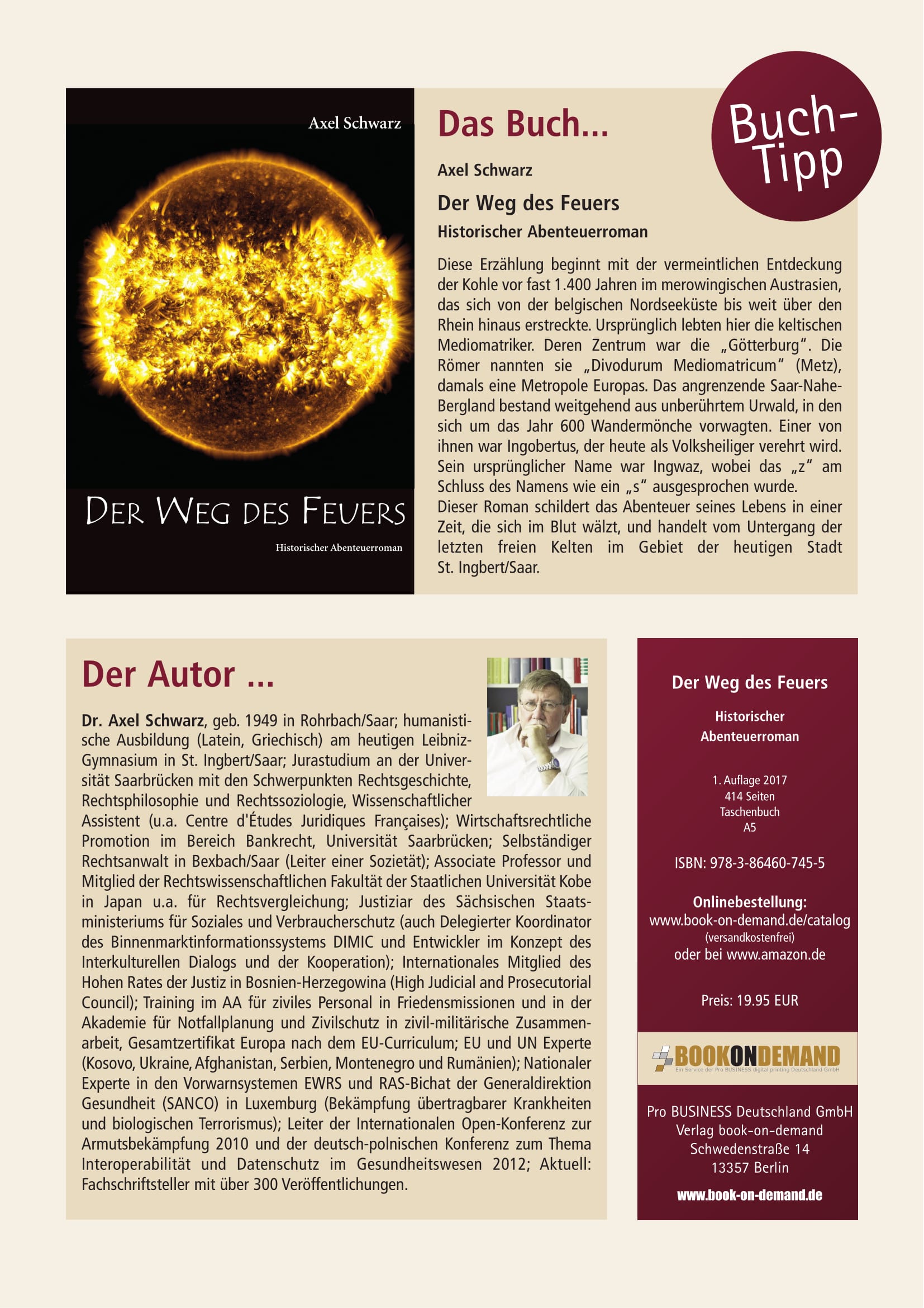 2017 Der gebürtige Rohrbacher Prof. Dr. Axel Schwarz stellt im Bürgerhaus seinen Historischen Abenteuerroman Der Weg des Feuers vor.