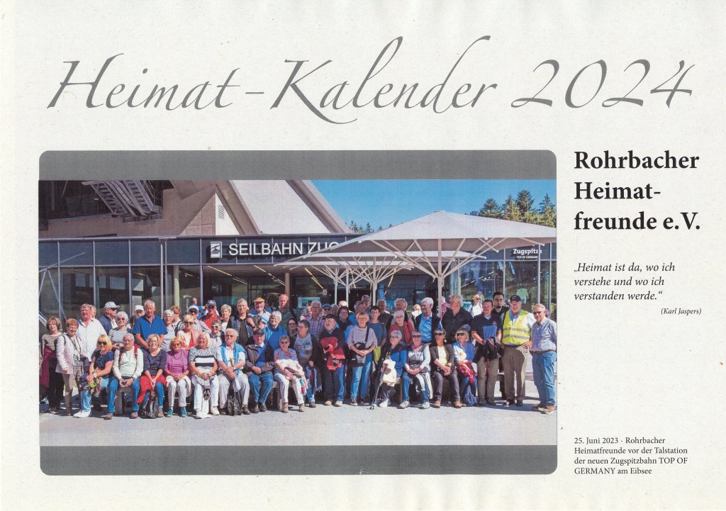 Aufmacher des neuen Kalenders ist ein Gruppenbild vom 25. Juni 2023 – Rohrbacher Heimatfreunde vor der Talstation der neuen Zugspitzbahn TOP OF GERMANY am Eibsee