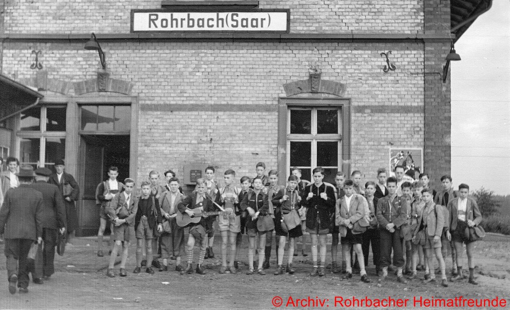 1953 Die Buben des Geburtsjahrganges 1939 mit ihrem Klassenlehrer Nicolaus vor dem Rohrbacher Bahnhof bereit zur Schulabschlussfahrt in den Schwarzwald und an den Bodensee
