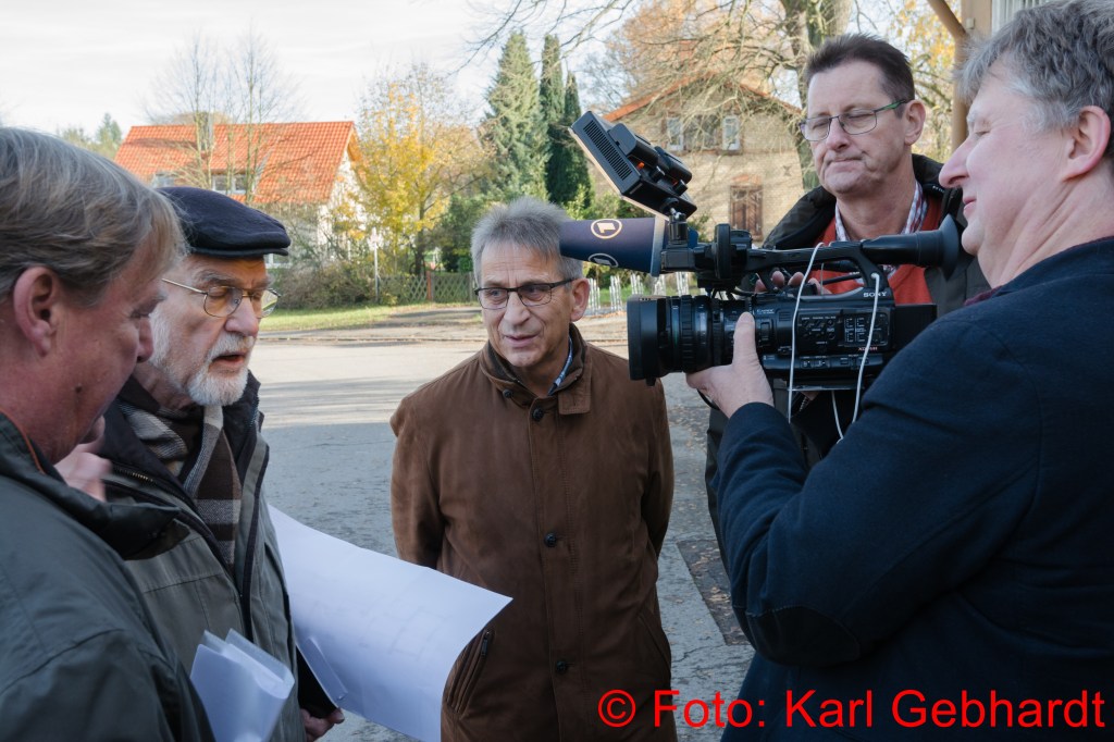 Der schändliche Zustand des Rohrbacher Bahnhofs war jetzt in aller Munde. Im November 2017 berichtete sogar der Aktuelle Bericht des Saarländischen Rundfunks darüber. Auf dem Foto von links: Ortsvorsteher Roland Weber, Heimathistoriker Friedrich Müller, Karl Abel. der stellvertretende Ortsvorsteher Jörg Schuh und der SR Reporter Herbert Mangold.