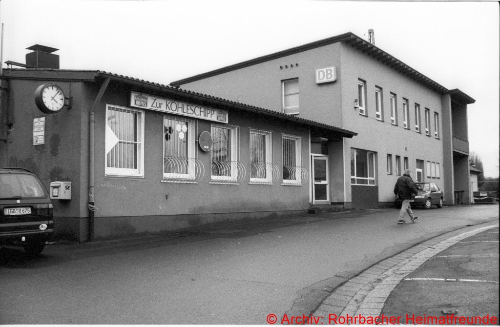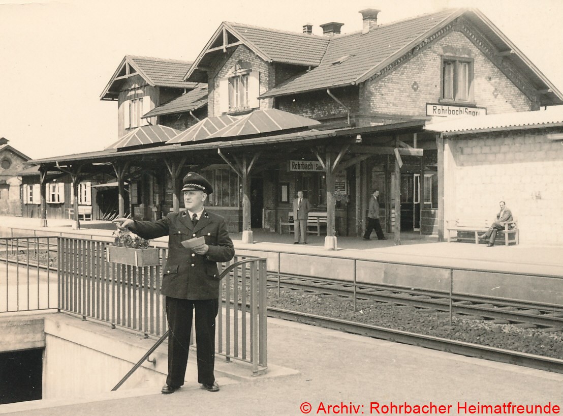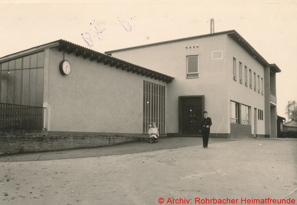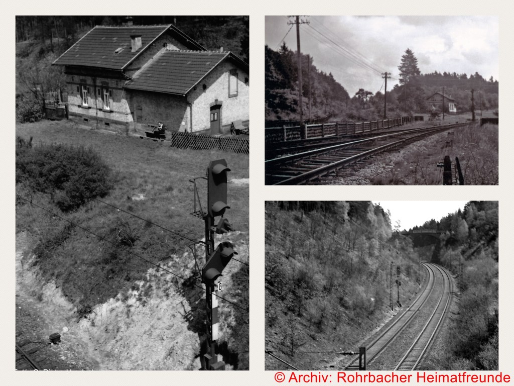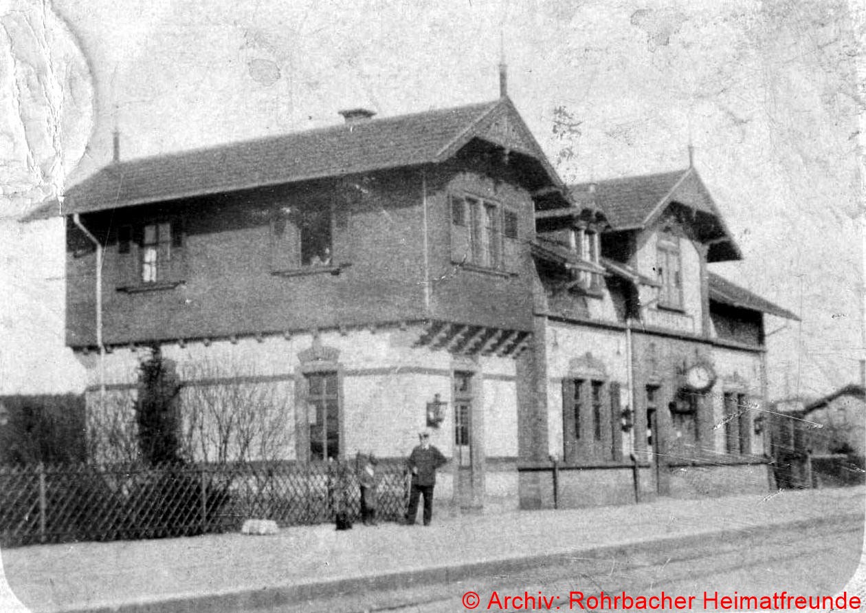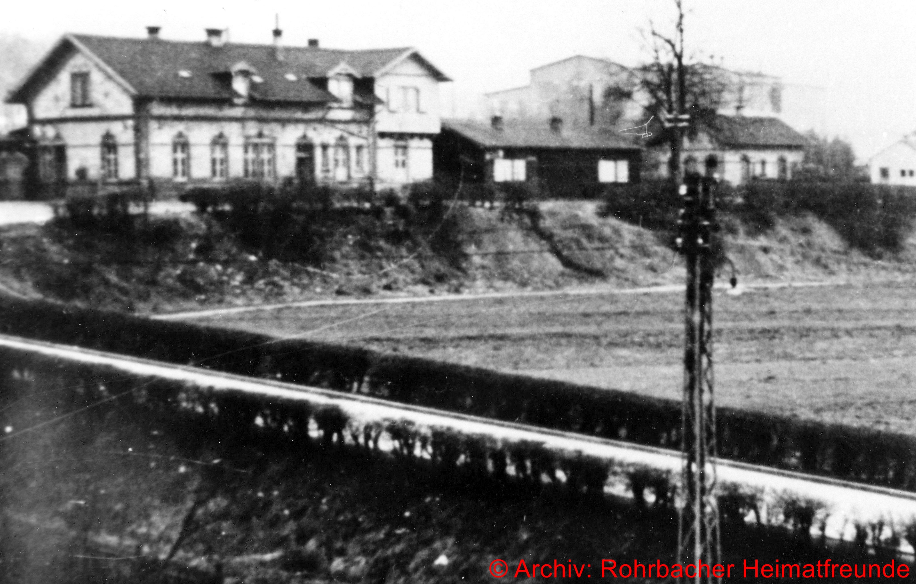 Der Rohrbacher Bahnhof in den Anfang 50er Jahren. Rechts neben dem Bahnhof die Baracke, in der die Bahnhofsgaststätte untergebracht war. Die Wirtin war Maria Bettinger („Bettingersch Marie“)