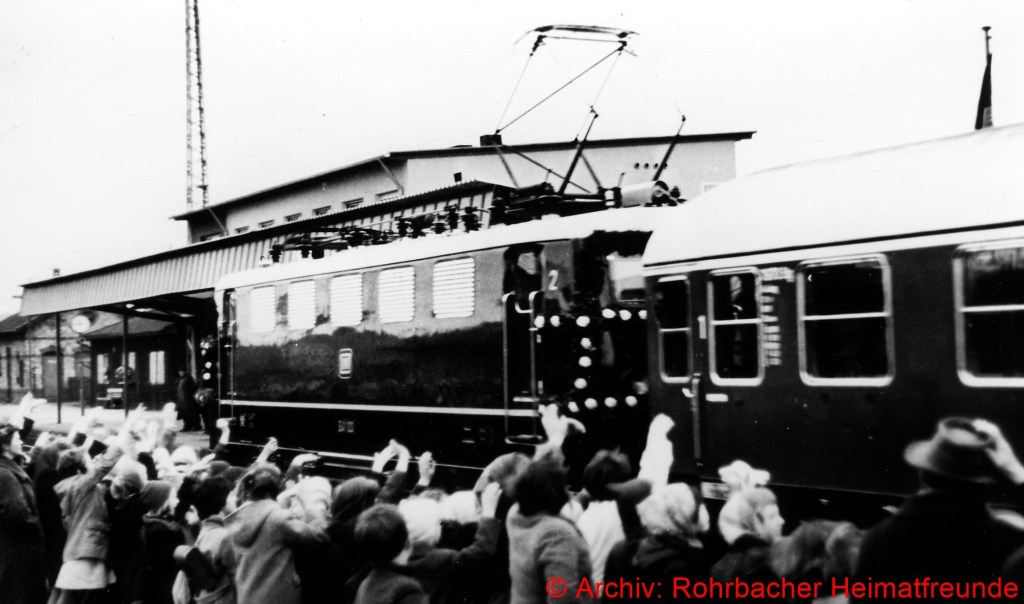 Am 08. März 1960 durchfuhr zum ersten Mal ein mit Elektrizität bewegter Zug den Rohrbacher Bahnhof, nachdem die Strecke Saarbrücken-Homburg auf den neuesten Stand der Eisenbahntechnik gebracht worden war.