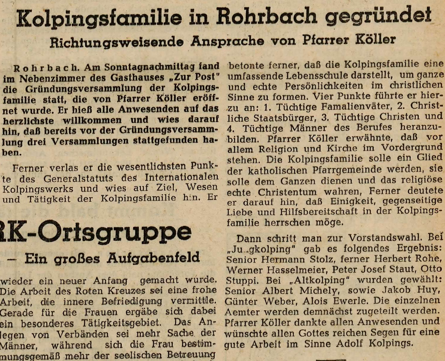 In einer mehrteiligen Serie soll die Geschichte der rührigen Rohrbacher Kolpingfamilie aufgezeigt werden. Im ersten Teil geht es um die Anfangsjahre von 1924 bis zur Wiedergründung nach dem 2. Weltkrieg im Jahr 1959.