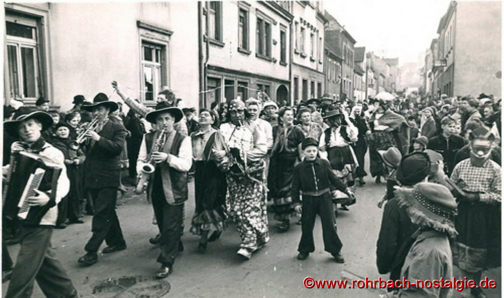 Die Kriegsjahre waren schon einige Zeit vergangen. Langsam schöpfte die Bevölkerung wieder Lebensmut. So erwachte Ende der 40er, Anfang 50er Jahre wieder das gesellschaftliche und kulturelle Leben, auch in Rohrbach. Geschäftsleute vom Gewerbeverein riefen die Rohrbacher Faasenacht ins Leben. Nun fanden überall in den bekannten Rohrbacher Gaststätten und Sälen, allen voran