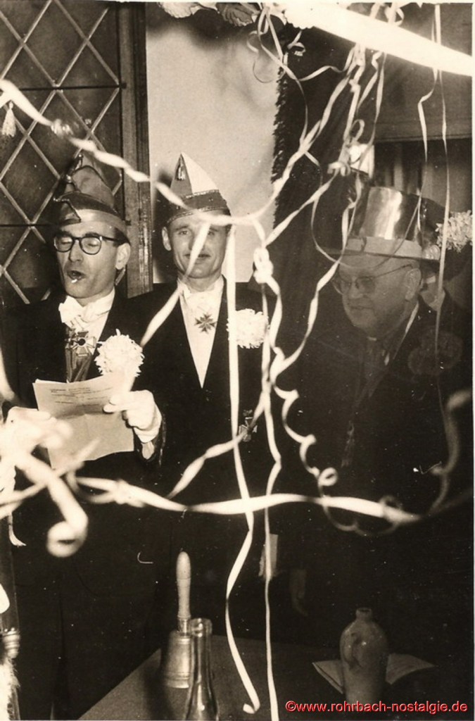 1956 Die Session stand unter dem Motto: „Rohrbach bei Nacht, sehen, staunen und schweigen“. Das Prinzenpaar Gerlinde Tillmanns und Manfred Staut wird im Sälchen des Gasthauses Persil proklamiert1956 Das Prinzenpaar Gerlinde Tillmanns und Manfred StautElferratspräsident Artur BanholzerBüttenredner Gerhard SchaarBürgermeister Jakob Oberhauser wird vom Sitzungspräsidenten Albert Walch zum Ehrensenator ernannt. In der Mitte Paul Reinhardt