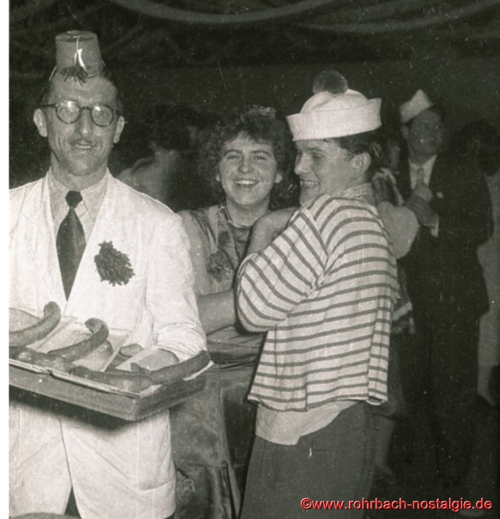 Im Jahr 1955 Hinten das Prinzenpaar Maria Rosa Michel und Günter Weber Der Elferrat von links: Hans Wagner, Artur Banholzer, Paul Reinhardt, Sitzungspräsident Albert Walch, Heinz Wadle, Adolf Hubatschek, Rudi Jacob, Rudi Schaar und Erwin Wolf1955 Das Prinzenpaar und die PrinzengardeVorne im Bild: Funkenmariechen Gerlinde TillmannsLudi Schöfer von der Tanzkapelle „Sonny BoysHeiße Würstchen – Heiße Edmund Gunkelmann1955 Beim Karnevalsumzug Paul Reinhardt, Willi Hausen und Heinz Wadle