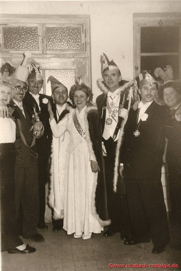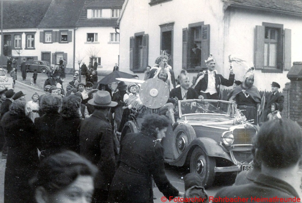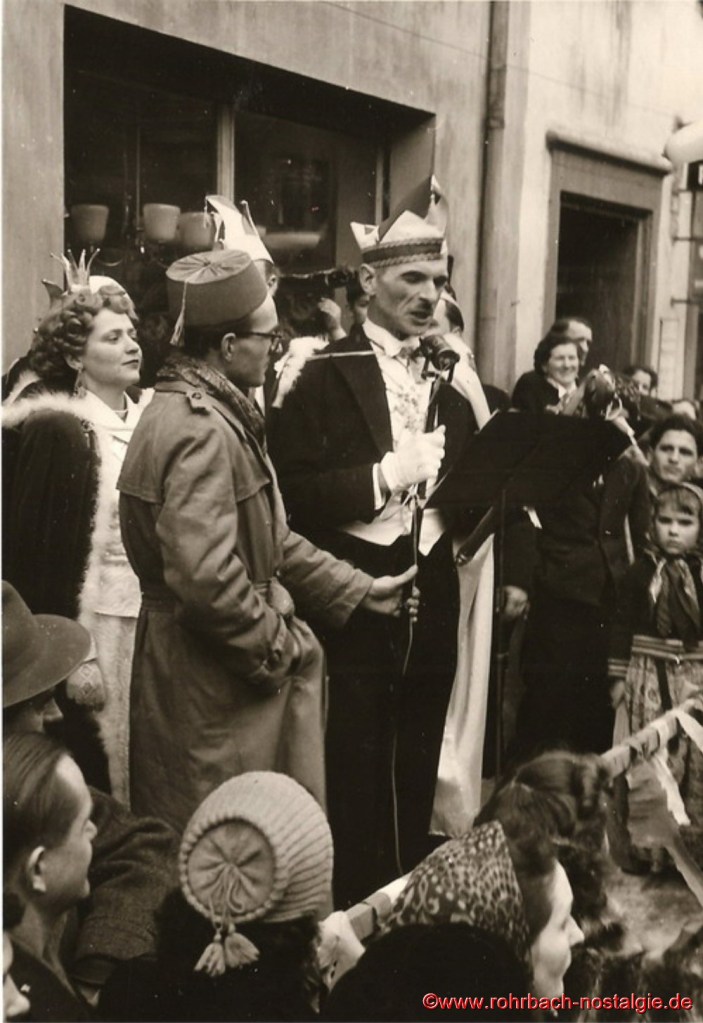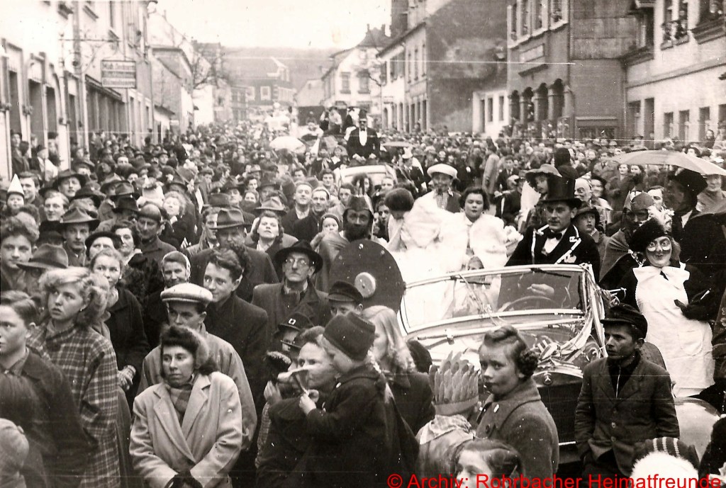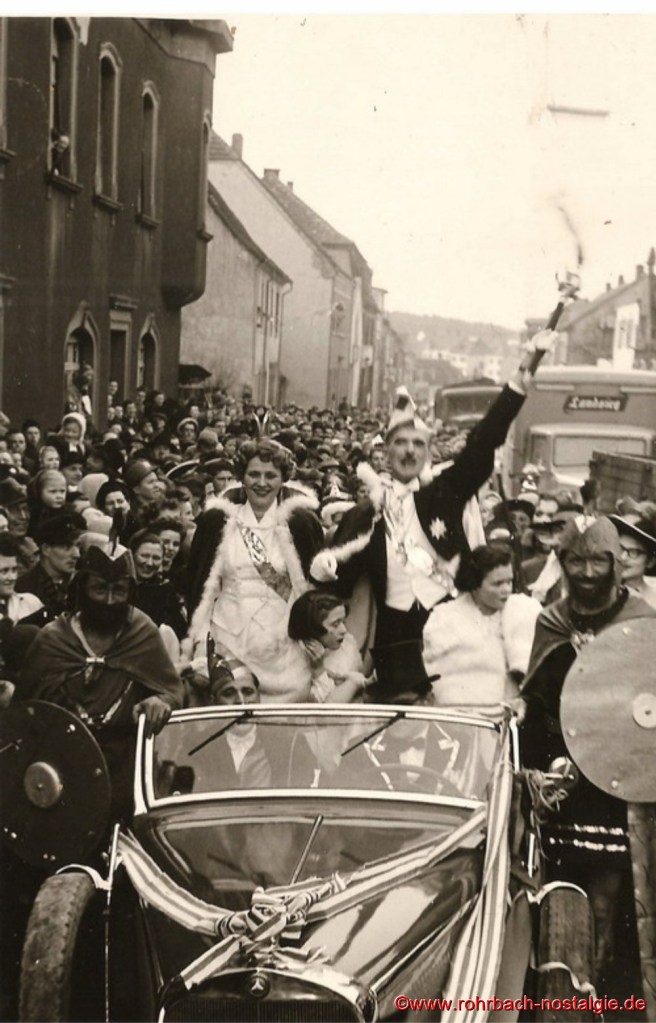 Ab 1949 wurden die Bestimmungen etwas gelockert. Wer „verboozt“ auftreten wollte, musste bei der Ortspolizeibehörde eine Maskenkarte beantragen. Verkleidet traf man sich an der Drehscheibe, um von dort von Wirtschaft zu Wirtschaft zu ziehen. 1954 organisierte dann die Interessengemeinschaft „Rat und Tat“ (Rohrbacher Geschäftsleute) erstmals einen großen Umzug. Er fand am Fastnachsdienstag, den 2. März statt. Auch hatte die närrische Gemeinde erstmals ein Prinzenpaar. Rita Wadle als Rita I. von Wadwolfshausen und Artur Banholzer als Artur I. von Finkendahlheim. Als Präsident des närrischen Staates Rohrbach fungierte Heinz Gehring (de Klowe).