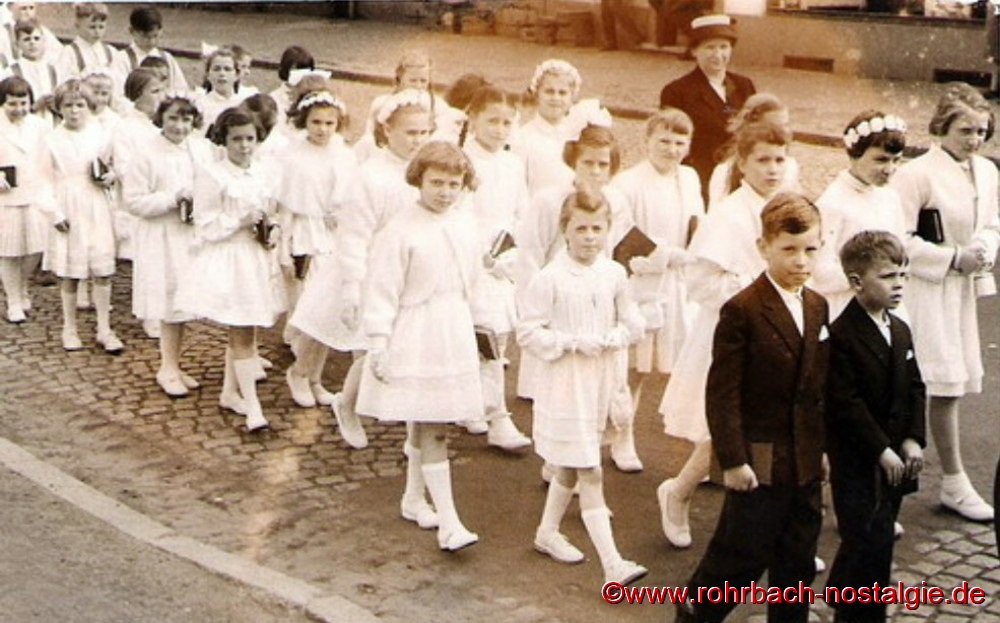 1957 Die Kommunionmädchen des Jahrganges 1948 bei der Grundsteinlegung der St.Konradskirche mit Lehrerin Frau Maria Becker