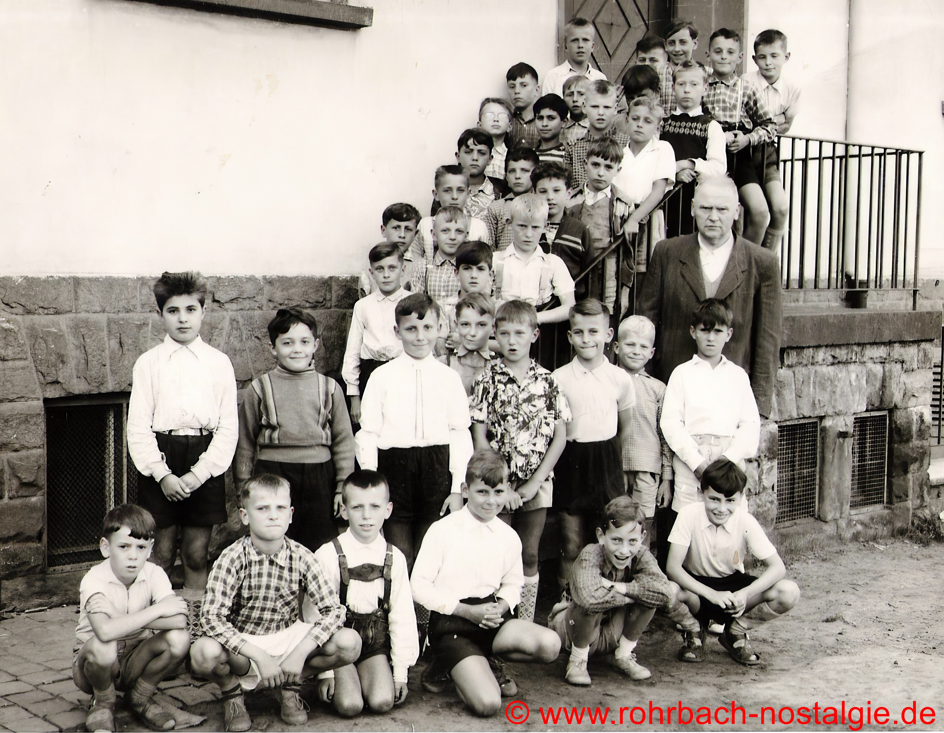 1958 Die Buben des Jahrganges 1948 auf der Treppe der Pestalozzischule mit Lehrer Friedrich Müller